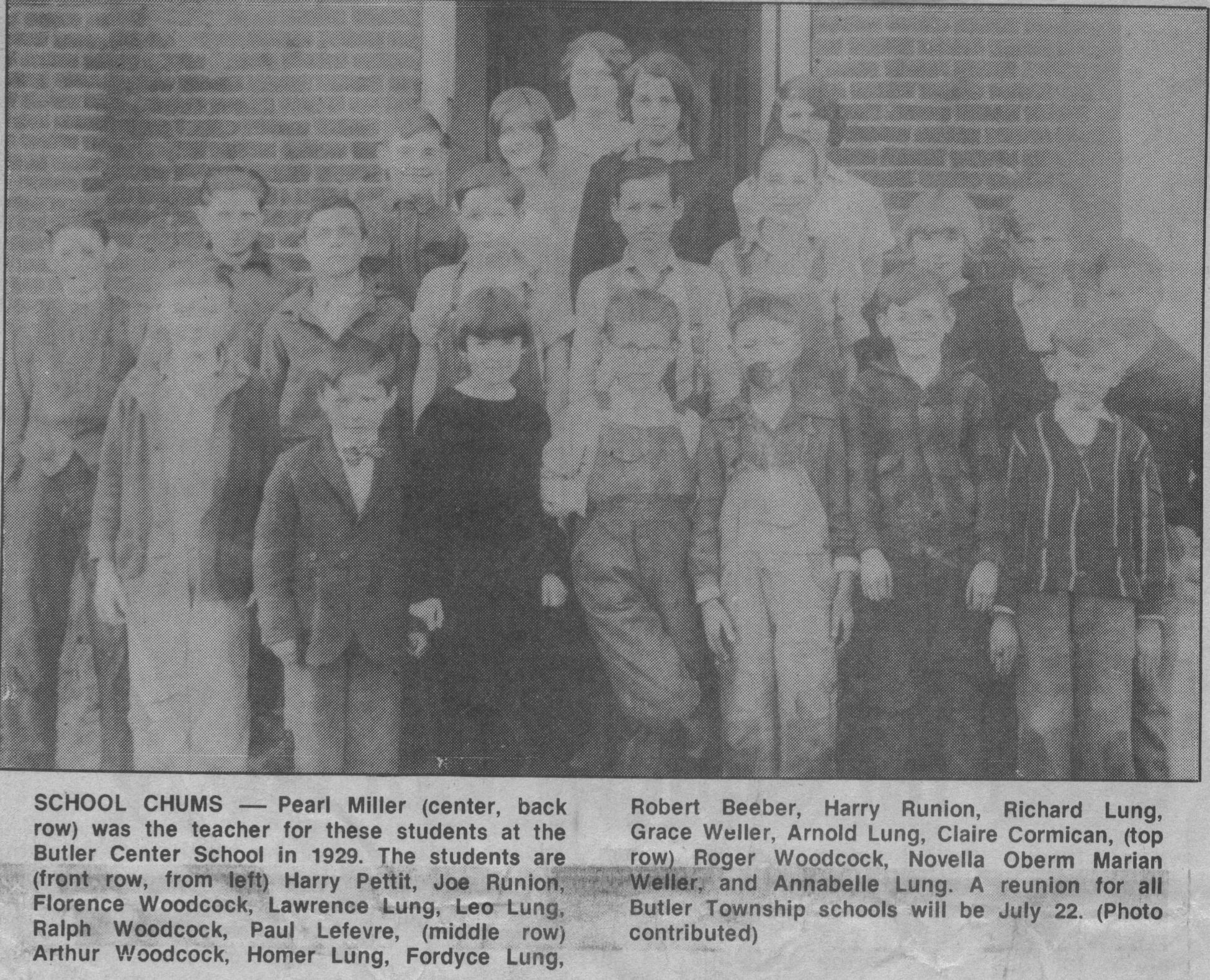 Butler Center School - 1929 3rd Row: Roger Woodcock, Novella Oberm, Marian Weller, Annabelle Lung 2nd Row: Arthur Woodcock, Homer Lung, Fordyce Lung, Robert Beeber, Harry Runion, Richard Lung, Grace Weller, Arnold Lung, Claire Cormican 1st Row: Harry Pettit, Joe Runion, Florence Woodcock, Lawrence Lung, Leo Lung, Ralph Woodcock, Paul Lefevre Teacher: Pearl Miller Submitted by Arlene Goodwin |
