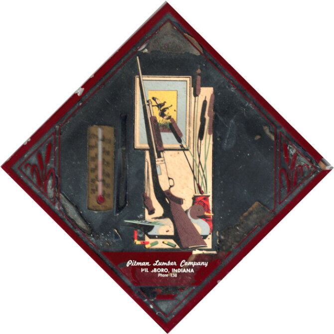Below we have an advertising plaque from the "Pitman Lumbar Company" The plaque shows an outdoor scene. It is on a mirrored background (actually the darkened surfaces are bright and shiny. There is a small thermometer inlaid on the left side of the plaque.