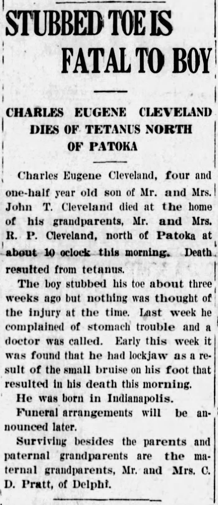 Husband of Anna May (PURCELL) CLEVELAND, 2nd, married 12 Nov 1918 in Marion County, Indiana. Son of James Harvey & Julia Ann (REEVES) CLEVELAND. Buried: 24 Dec 1918. |
