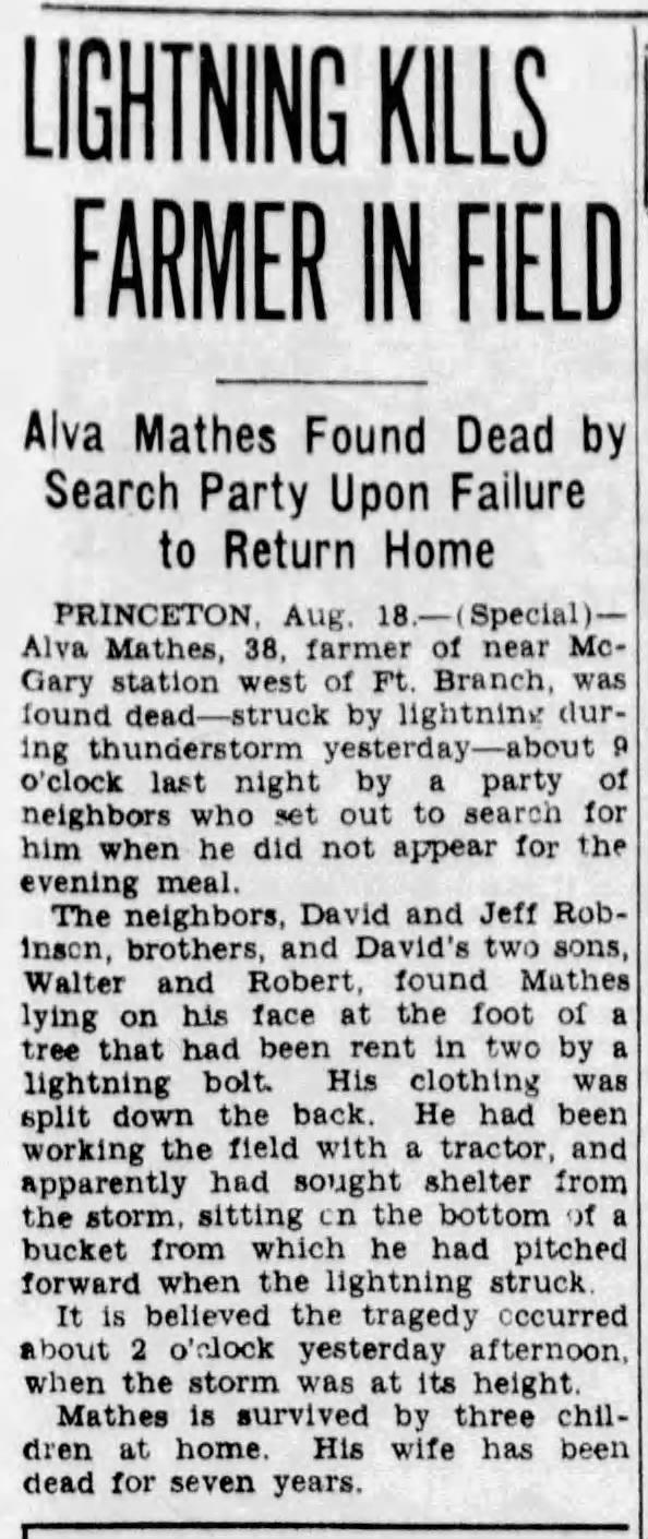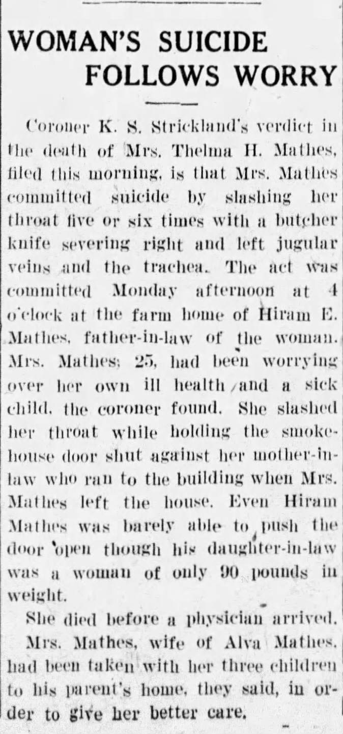JOHNSON. Wife of Alva C MATHES. Married 16 Jun 1918. Daughter of James & Rhoda A JOHNSON. Died by suicide (slashed her own throat). In 1932, her husband Alva would be struck and killed by lightning. |