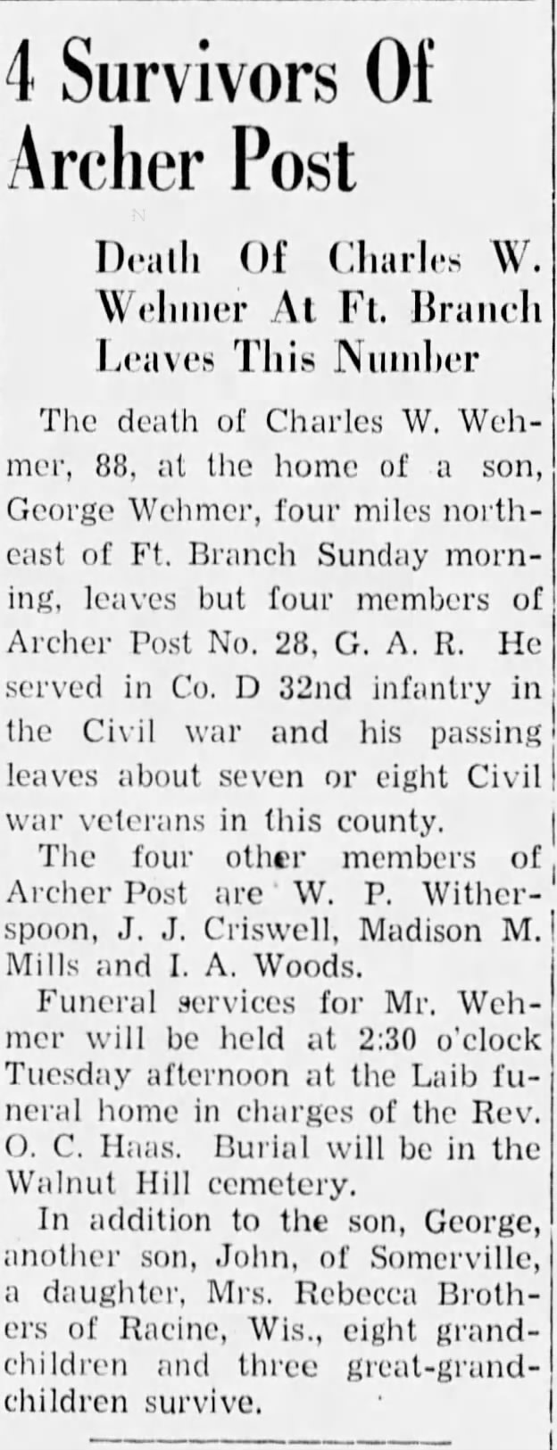 18 Mar 1875. Son of William WEHMER. “Father” Pvt., Co. D, 32nd Reg. Indiana Infantry. Enlisted on 3 Oct 1864, mustered out on 4 Oct 1865.