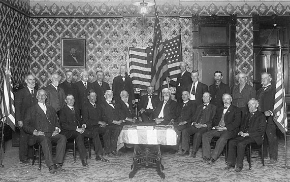 The officers in this Photo of a Grand Army of the Republic meeting noted on the back of the picture are: Tom NYE, ROBINSON, N.N. BOYDSTON, PETERSON, MOMS, ATWOOD, J.W. ARMSTRONG.