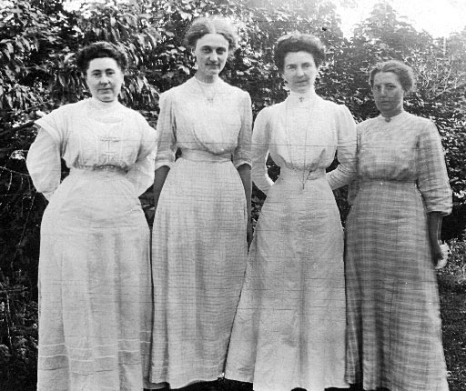 Left to Right: Martha Gregg, 1870-1957, daughter of John L. Gregg and Mary M. Creager. Myrtle Creager, born ca 1880, daughter of George W. Creager and Jennie M. Detamore. Emma Gregg, 1872-1956, daughter of John L. Gregg and Mary M. Creager. Mattie Creager, 1878-1935, daughter of James Creager and Elizabeth Rapp.