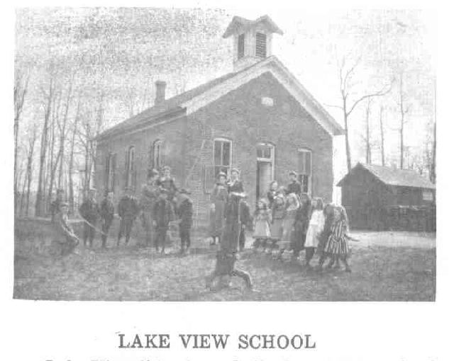 by Carson Siddles, later known as the Allison Brownlee Farm. Lincoln TwpLAKE VIEW SCHOOL - Lake View School was built about 1890, on land settled by Carson Siddles. This was later known as the Allison Brownlee Farm. The building was built in a north and south direction, with a door in the north. In the middle of the room there was a large round wood burning stove. On each side were several rows of seats. Across the south end of the building there was a platform with black boards on the wall. In front of the platform was the teachers desk and also recitation seats. On each side of the door was a cloak room. School was held here for about 20 years. In 1932 it was torn down with the wood part of the building being sold. It is now a part of the home of Walter Wilson.
