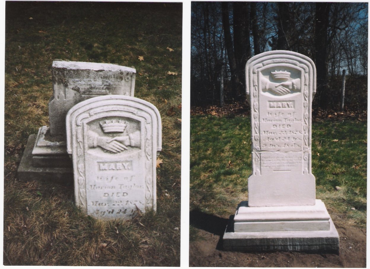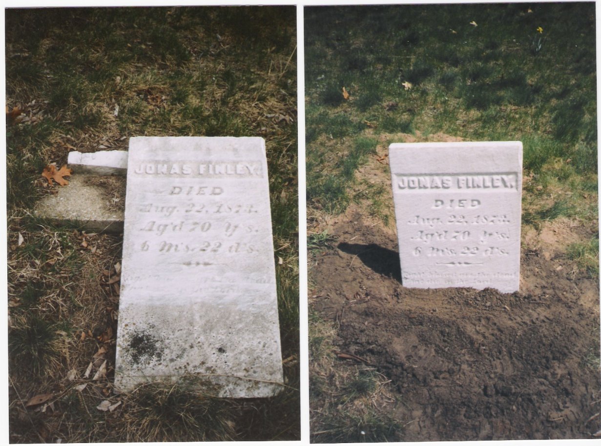 Mark Davis has been employed by Pat Harris of the Pioneer Cemetery Commission to repair some of the broken stones within the county cemeteries. Please note, if cemeteries are intrusted to an association, example, Sauktown Cemetery etc., or a city cemetery such as Greenwood Cemetery in Michigan City or Pine Lake Cemetery in LaPorte, then it falls under their jurisdiction of those in charge of that cemetery to hire craftsman and see repairs are done.
