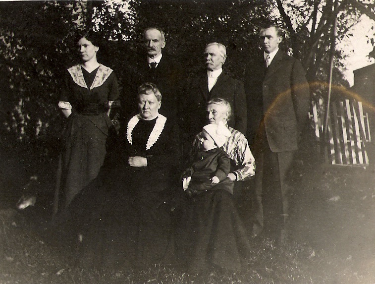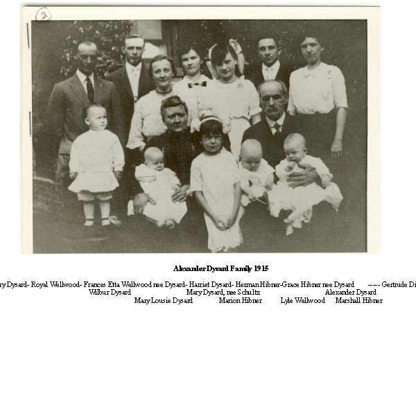 Wellwood 1915 photo Standing: Frances Etta Wellwood (nee Dysard), Alexander Dysard, Ephraim Wellwood, Royal Wellwood Sitting: Mary Dysard (nee Schultz), Lucinda Wellwood (nee Starr), holding Lyle Wellwood, LaPorte, Indiana 1915 |