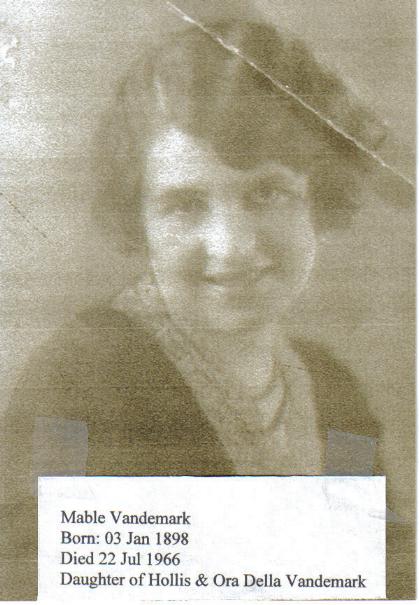 Vandemark, b 03 Jan 1898 Mentone, Ind. d 22 Jul 1966 Logansport, Ind. She is the second oldest child of Hollis and Ora Della Vandemark. She married Lester F. Mehrly & Elsworth Bishop. |