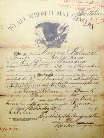 Harvey Holmes, according to his discharge papers, information from the Internet and Drake family archives, joined the 29th Regiment Indiana Infantry in 1861 at the same time his father, Samuel Holmes, joined the 9th Regiment Indiana Infantry.