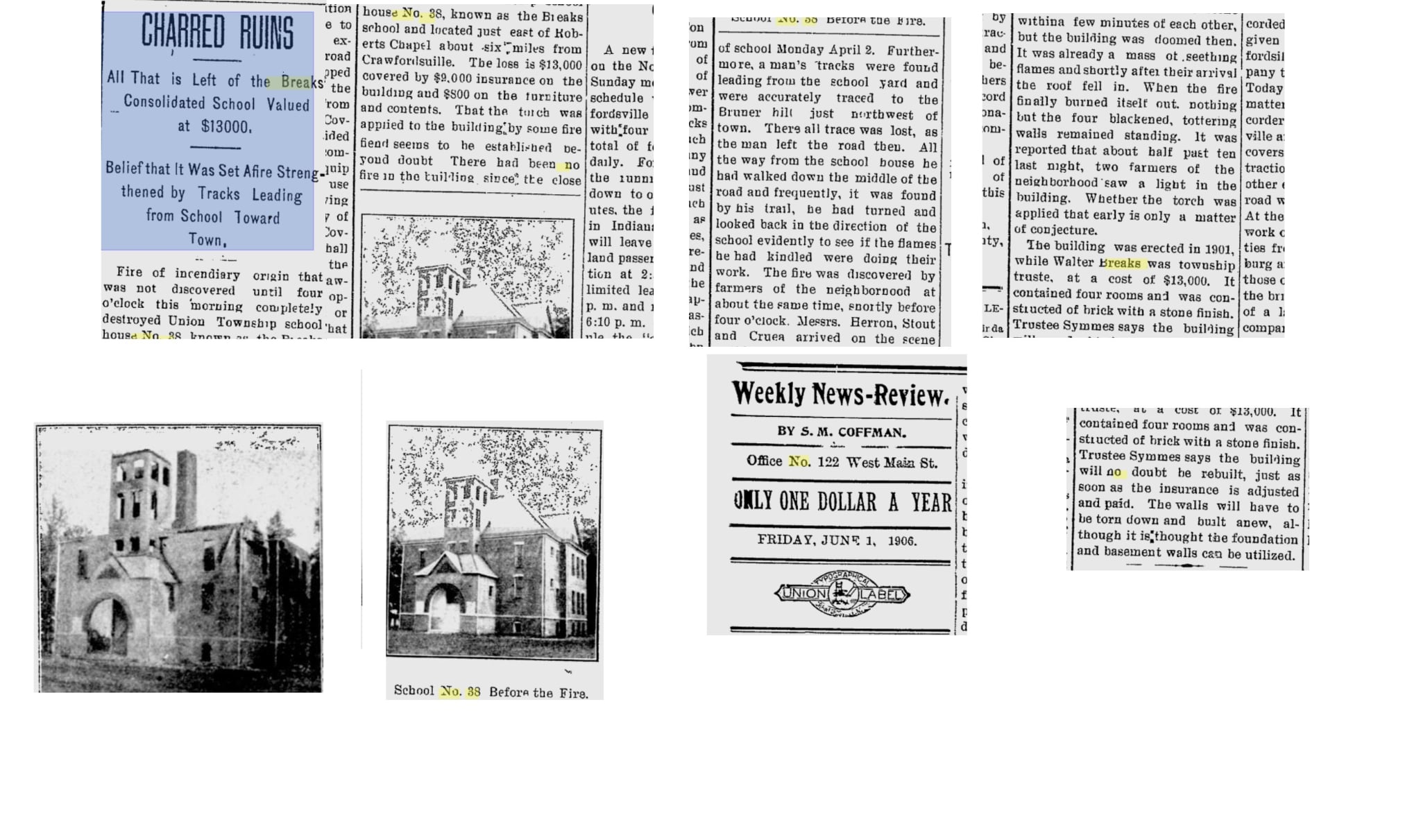 Breaks School burned early in 1906