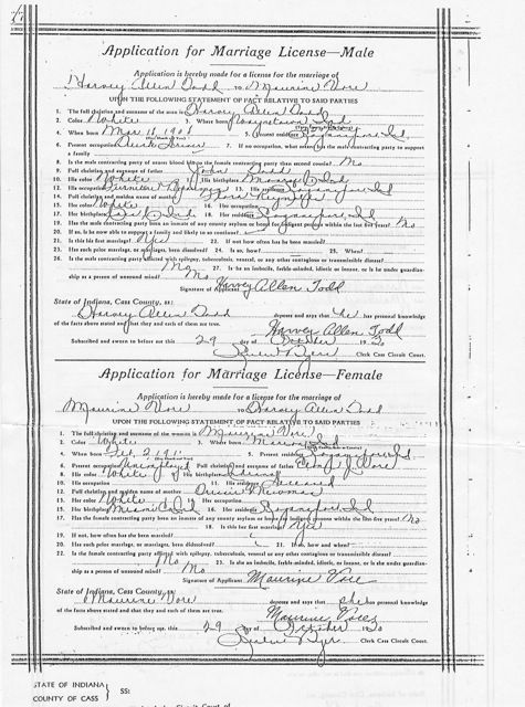 Announcement is made of the marriage of Miss Maurine VORE and Allan (Allen) TODD, both of this city which took place at 6:30 Wednesday evening in the manse of the Broadway Universalist Church. The couple departed immediately following the ceremony for Indianapolis.