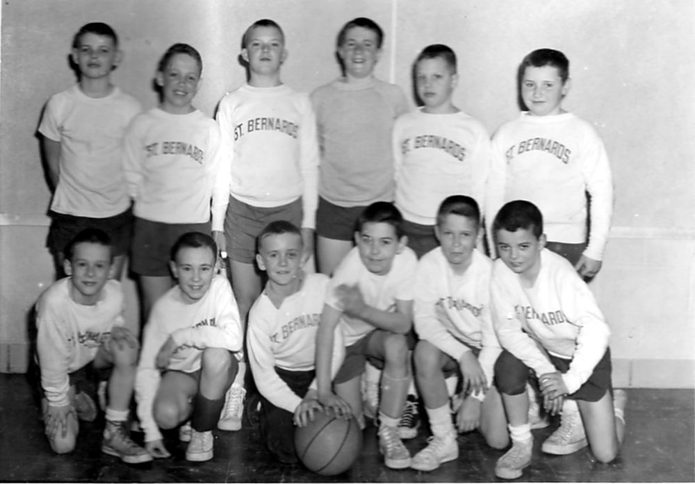 St. Bernards Boys Basketball Team 1958-59 Front Row:Jack Slatery, Eddie Stewart, Mike McCafferty, Kelly Cockran,Fred Lamb, John Peacock; Back row: Alan Dick, om Lamb, Jim Redmond,Jim Zach, John Miley, Tom Runge.