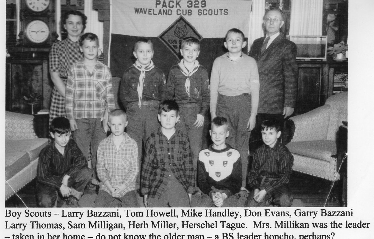 BOY SCOUT TROOP 329 of Waveland Scouts of 1958-59 Listed front row: Larry Bazzani, Tom Howell, Mike Handley, Don Evans, Garry Bazzani; Second row: Larry Thomas, Sam Milligan Herb Miller, Herschel Tague. Mrs Millikan was the leader - photo taken in her home - unknown male leader.