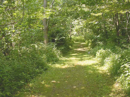 Beautiful. Serene and silent except for the soft sounds of birds in the thick wall of old trees on either side. The path appeared to be mowed and clear of debris. We walked more than a "city block" before coming into a small clearing canopied by more ancient trees. At the other side of the clearing, our path appeared to continue up a slight hill.
