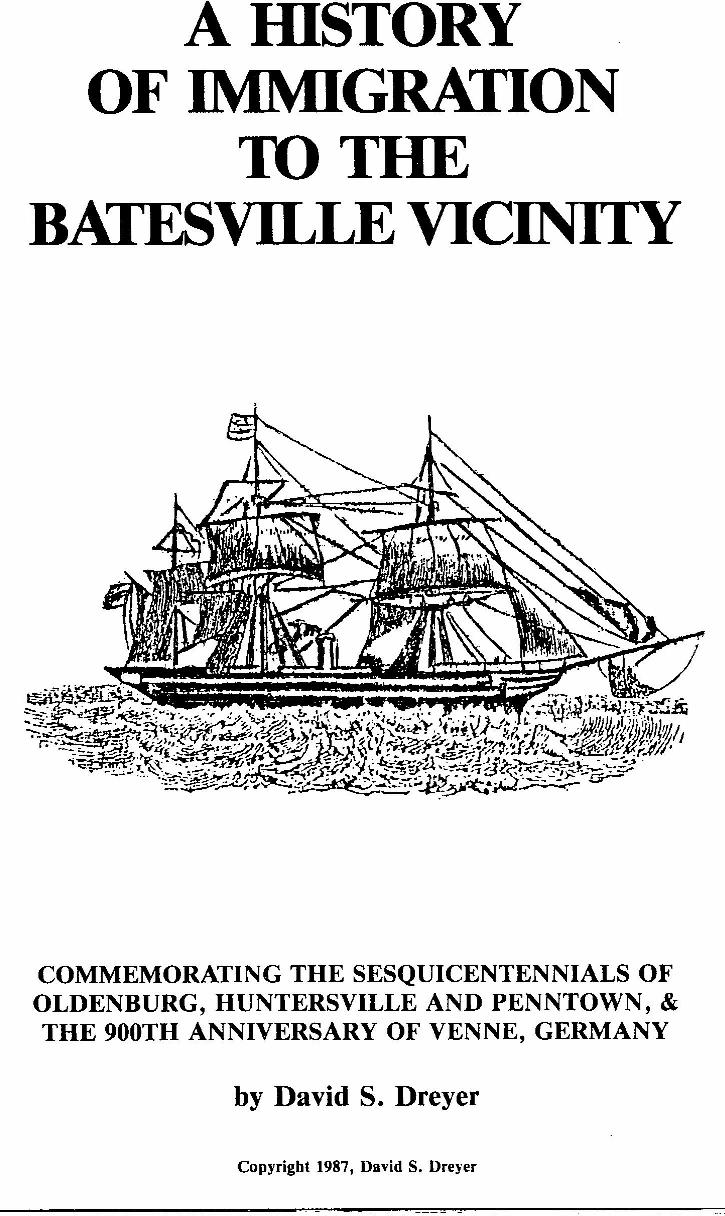 Much of the settlement of the Batesville vicinity canbe traced back to three areas in northern Germany which were not very farfrom each other: Huntersville to Venne, Engter, Bramsche and surroundingcommunities just north of Osnabrueck in the Kingdom of Hannover; Oldenburgto Damme Parish about ten miles further north in the Grand Duchy of Oldenburg;and many German settlers in Adams and Laughery townships to HeiligenfeldeParish about forty-five miles further northeast in the Kingdom of Hannoverjust south of Bremen.