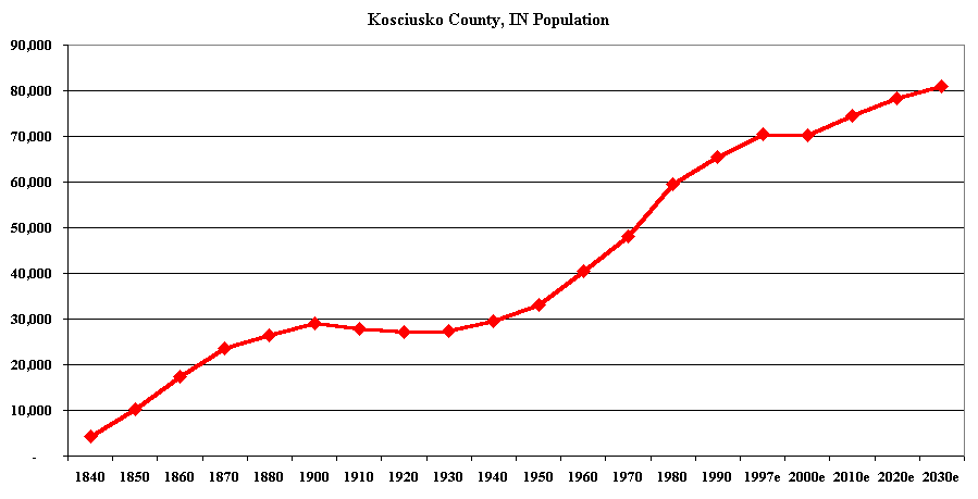 Kosciusko County was organized in April, 1836. Prior to this most of the land was part of a large Cass County, with a tiny sliver of Turkey Creek and Tippecanoe Townships part of a larger Allen County. Complete Census Transcriptions are currently on line for both 1840, 1850, 1860 and 1870, each with an everyname index. Also available are the Mortality Schedules for 1850 and 1860. The LDS now has the complete 1880 on-line at familysearch.org.